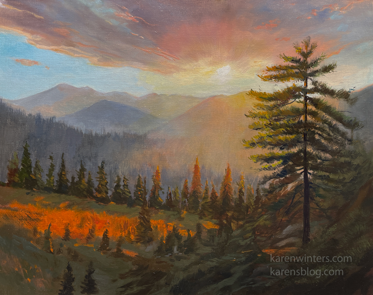 ![]() San Gabriel Sunset with Big-coned Douglas Fir 11 x 14 inches oil painting |